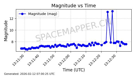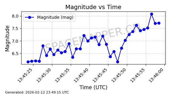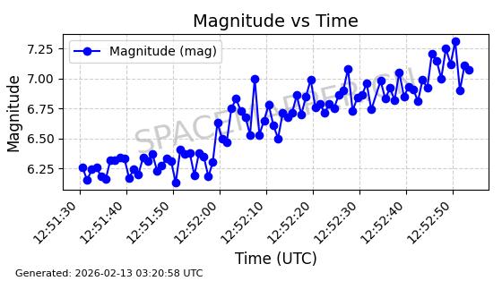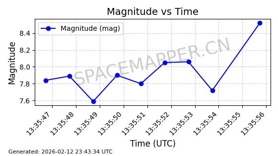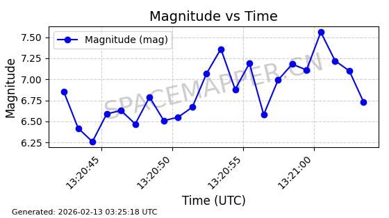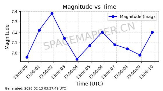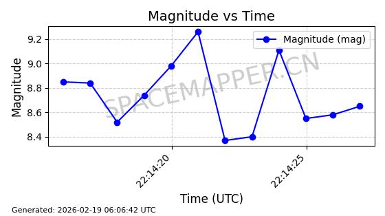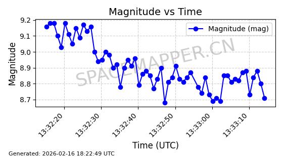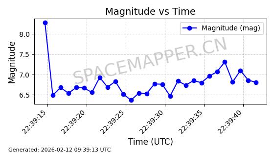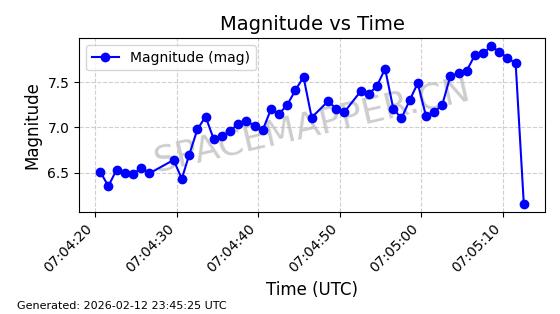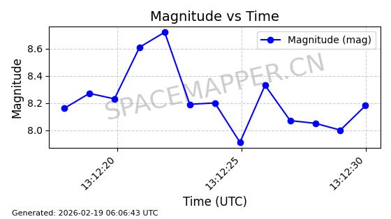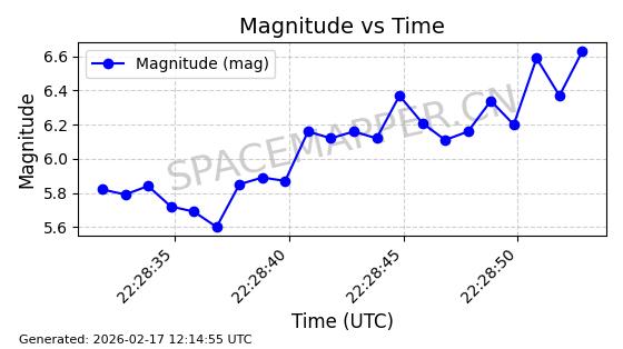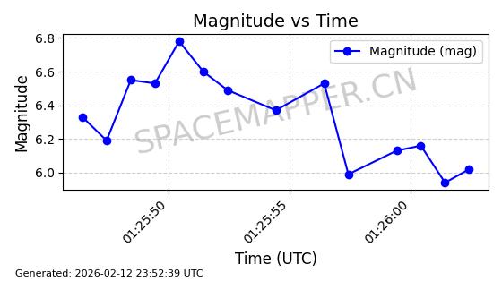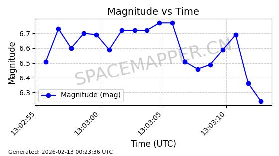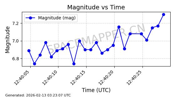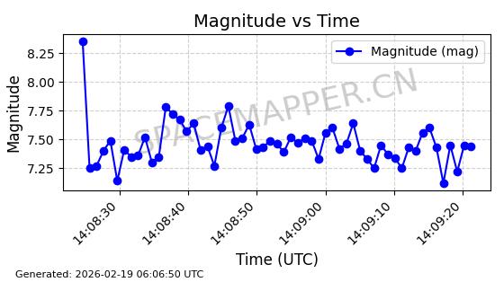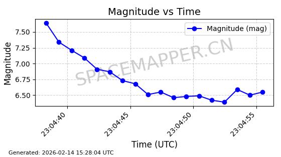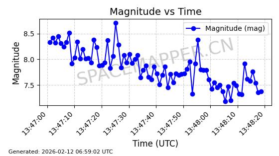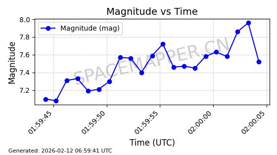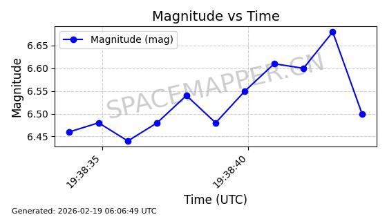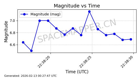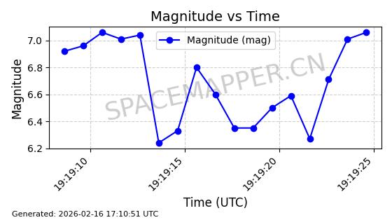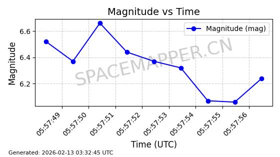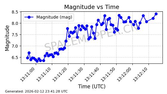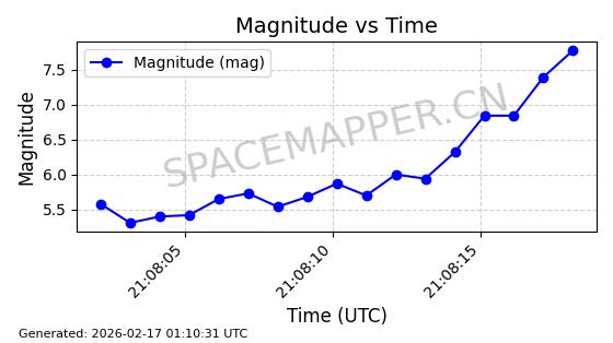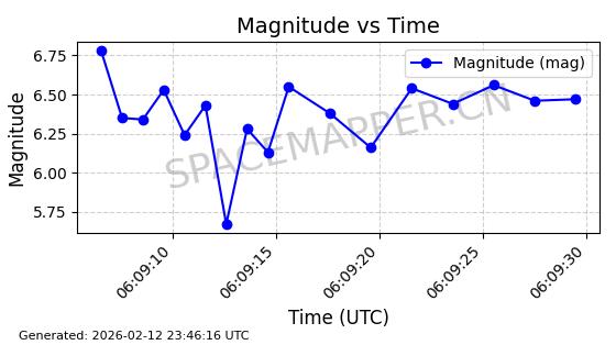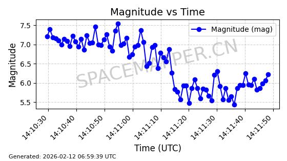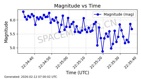 | STARLINK-6325 | 56789 | 56789 | 2023-05-31 同日期轨道 2023-078Y 同批次轨道 | 已陨落 | 88分钟 | 69.9883 | 147.542 | 159.758 | 0.0009351 | 2025-09-16 19:00:34 | ||