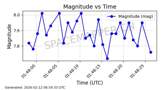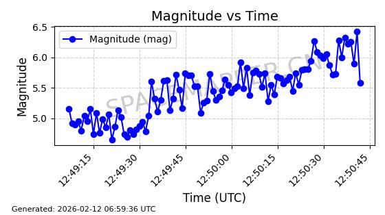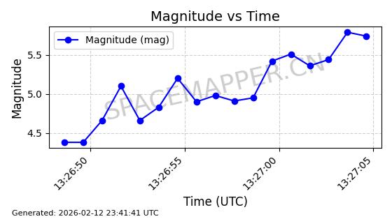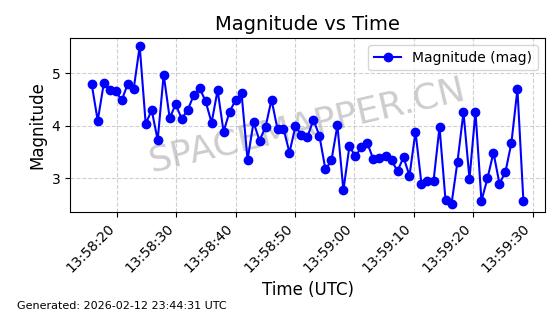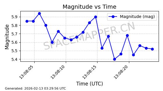| STARLINK-5982 | 56817 | 56817 | 2023-05-31 同日期轨道 2023-078BC 同批次轨道 | 已陨落 | 87分钟 | 69.9773 | 139.982 | 152.246 | 0.0009398 | 2026-02-12 08:53:53 | ||