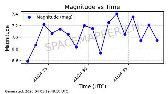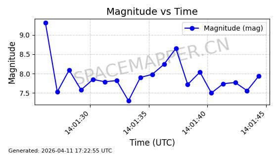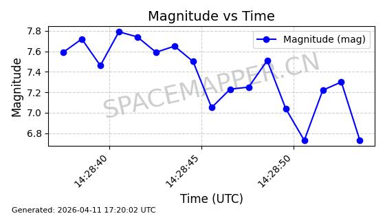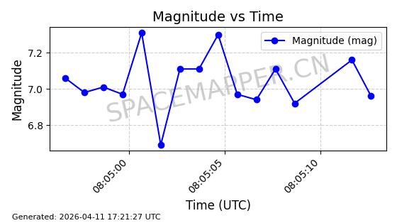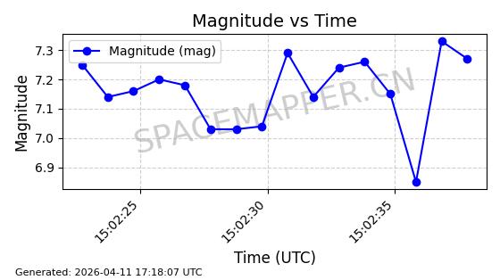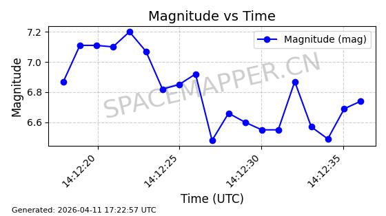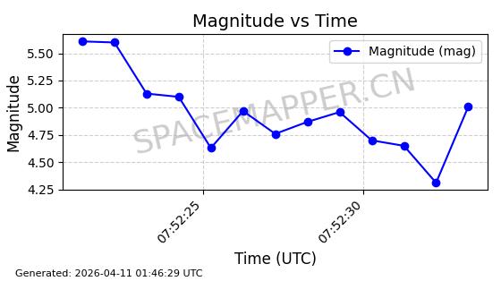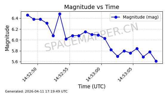 | STARLINK-3846 | 52647 | 52647 | 2022-05-14 同日期轨道 2022-052BB 同批次轨道 | 已陨落 | 88分钟 | 53.2042 | 172.553 | 175.479 | 0.0002232 | 2025-11-14 06:21:30 | ||