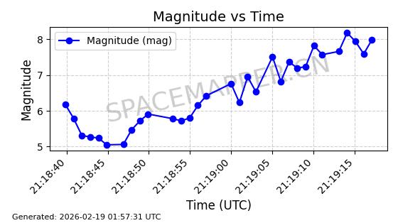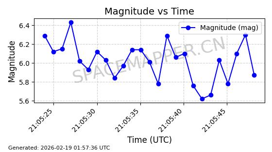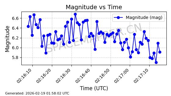 | STARLINK-6367 | 57376 | 57376 | 2023-07-16 同日期轨道 2023-099BA 同批次轨道 | 在轨 | 96分钟 | 43.0030 | 557.73 | 560.382 | 0.0001910 | 2026-02-18 05:36:30 | ||