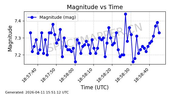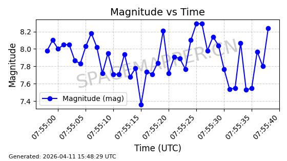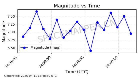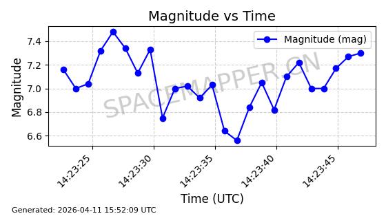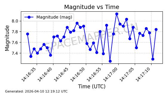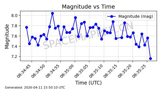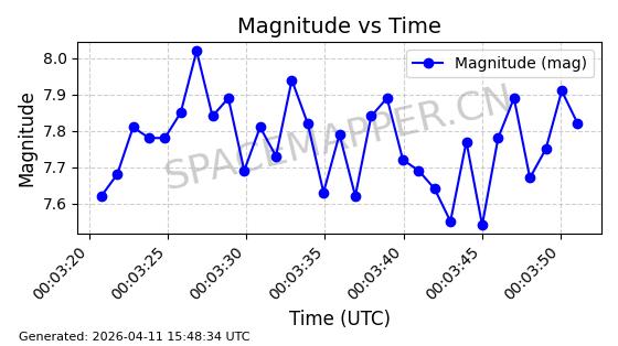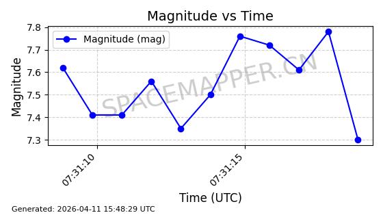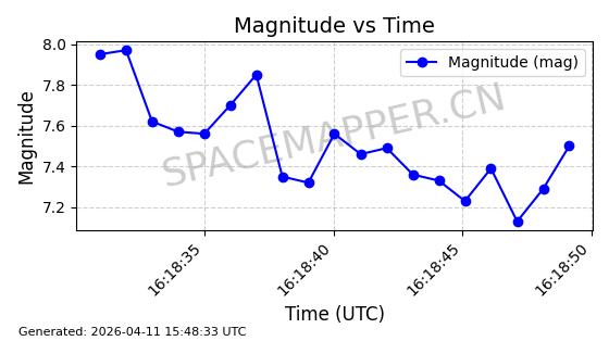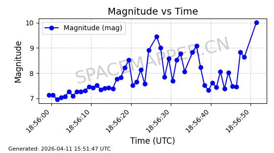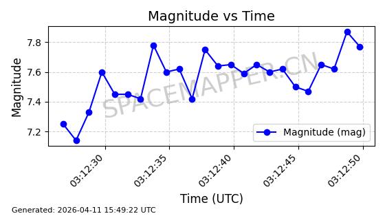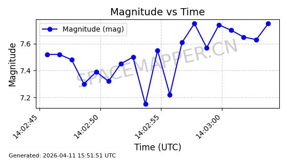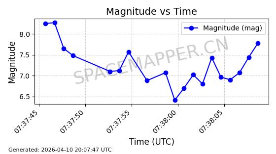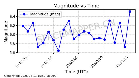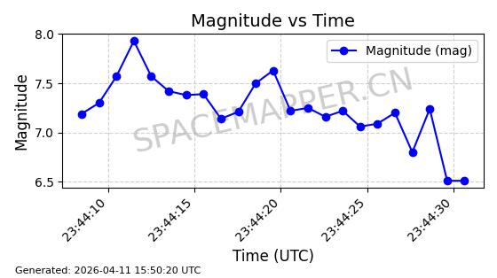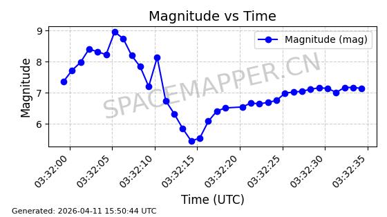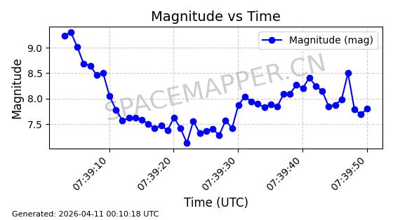 | STARLINK-4038 | 53150 | 53150 | 2022-07-17 同日期轨道 2022-083U 同批次轨道 | 已陨落 | 87分钟 | 53.1842 | 143.821 | 150.857 | 0.0005391 | 2026-03-31 07:38:50 | ||