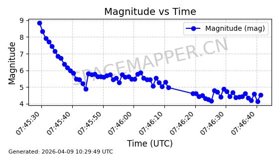 | STARLINK-4029 | 52685 | 52685 | 2022-05-18 同日期轨道 2022-053AF 同批次轨道 | 在轨 | 95分钟 | 53.2177 | 538.774 | 540.712 | 0.0001400 | 2026-04-09 23:51:45 | ||