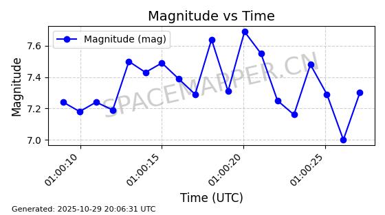 | STARLINK-1150 | 45067 | 45067 | 2020-01-29 同日期轨道 2020-006Z 同批次轨道 | 已陨落 | 88分钟 | 53.0294 | 167.914 | 177.016 | 0.0006947 | 2025-10-06 00:49:41 | ||