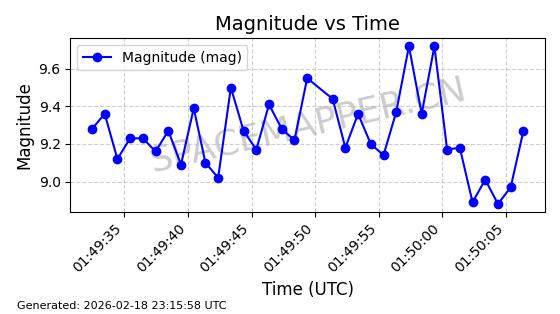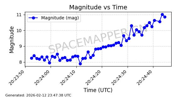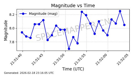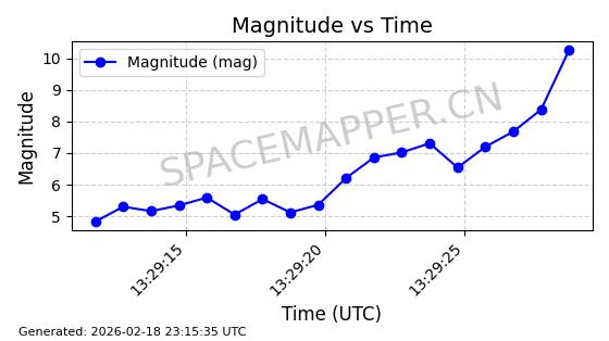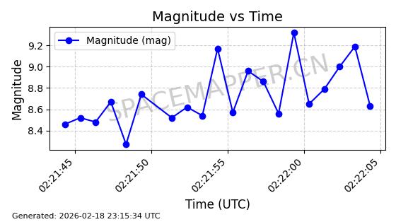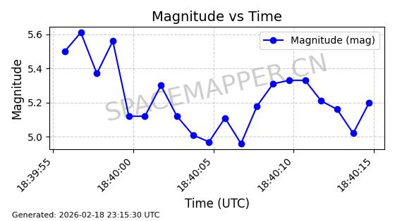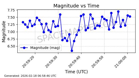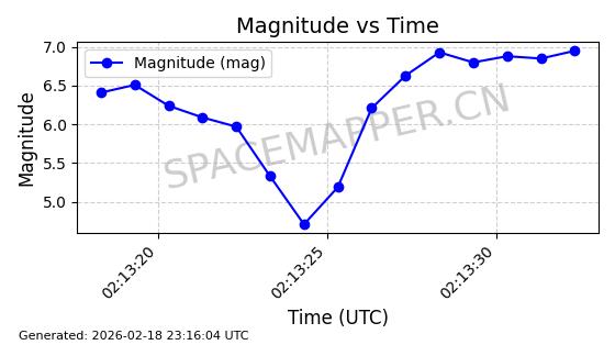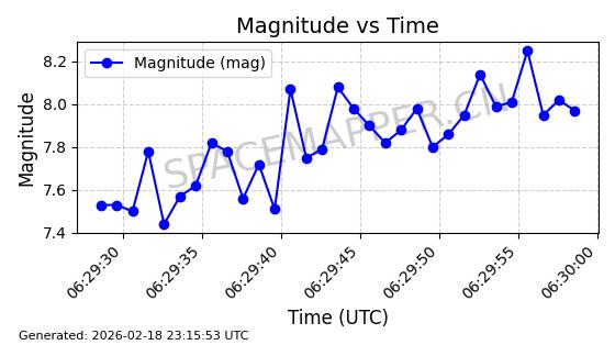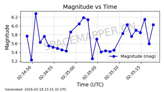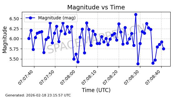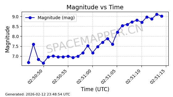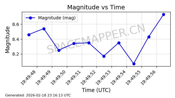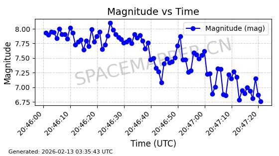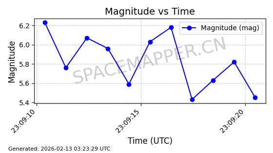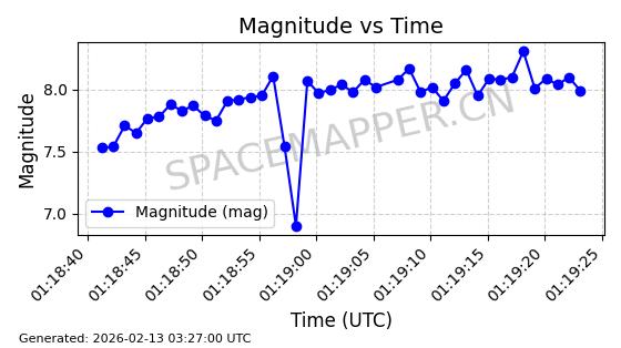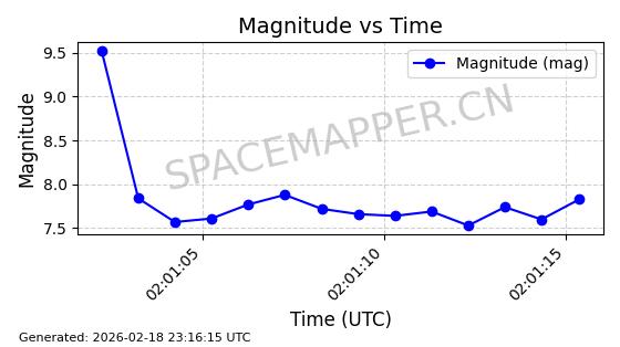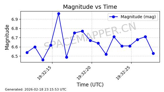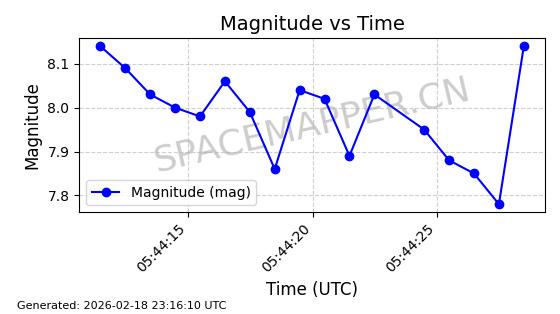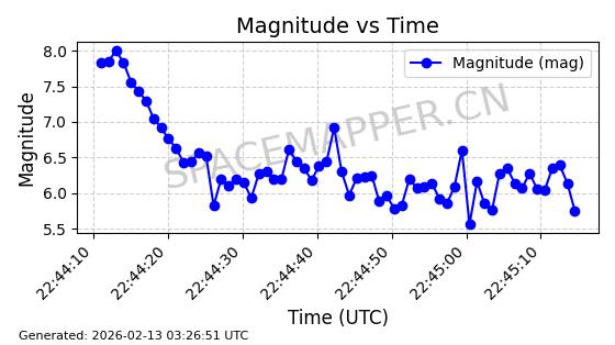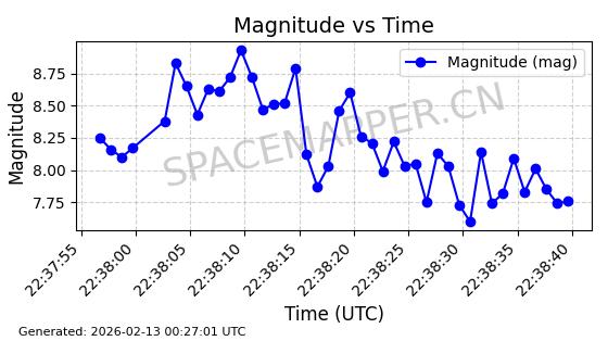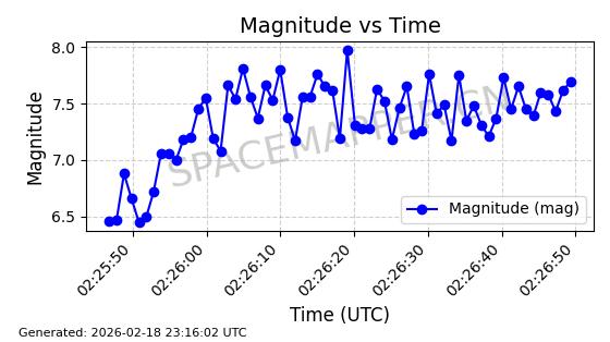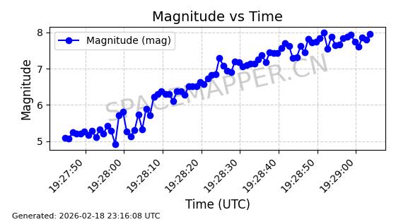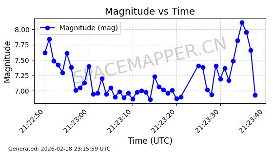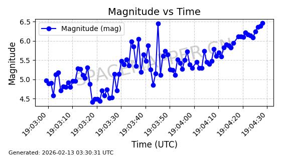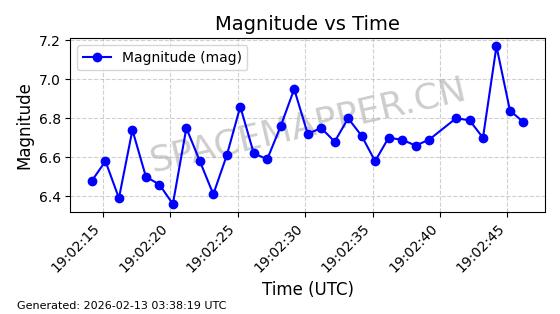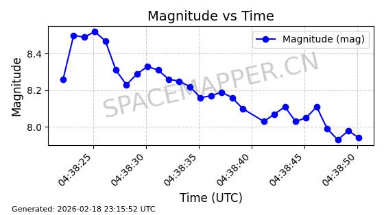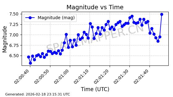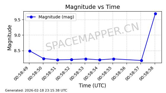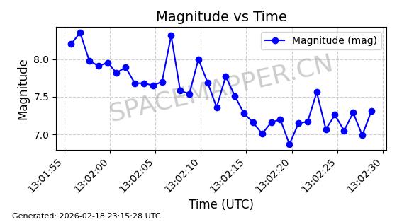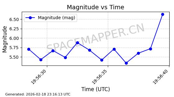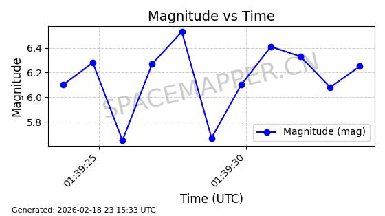 | STARLINK-30559 | 58039 | 58039 | 2023-10-09 同日期轨道 2023-156M 同批次轨道 | 在轨 | 91分钟 | 53.1398 | 314.291 | 331.757 | 0.0013031 | 2026-02-18 02:51:16 |