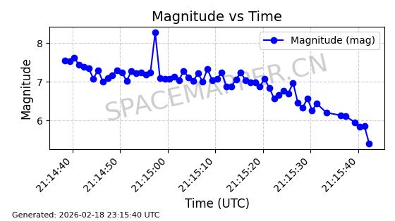 | STARLINK-30714 | 57939 | 57939 | 2023-09-25 同日期轨道 2023-148E 同批次轨道 | 在轨 | 94分钟 | 53.1576 | 474.468 | 475.984 | 0.0001106 | 2026-02-18 04:42:37 | ||