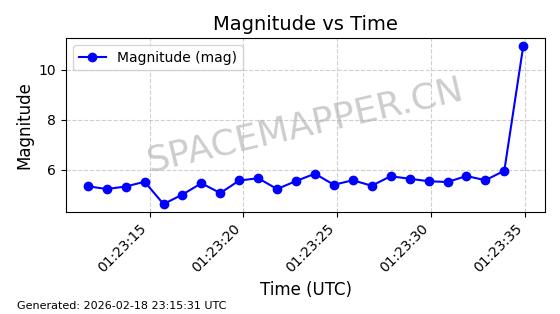 | STARLINK-30701 | 57950 | 57950 | 2023-09-25 同日期轨道 2023-148R 同批次轨道 | 在轨 | 94分钟 | 53.1602 | 474.372 | 476.158 | 0.0001302 | 2026-02-18 04:10:43 | ||