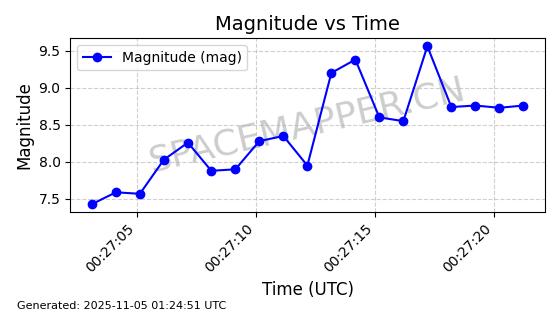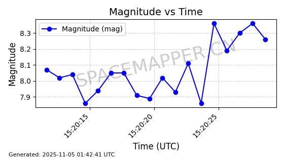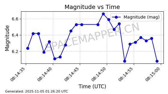 | STARLINK-4650 | 53611 | 53611 | 2022-08-28 同日期轨道 2022-104Z 同批次轨道 | 已陨落 | 88分钟 | 53.1516 | 131.226 | 204.41 | 0.0055899 | 2025-08-15 06:16:44 | ||