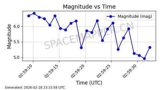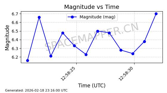 | STARLINK-30582 | 58059 | 58059 | 2023-10-13 同日期轨道 2023-158J 同批次轨道 | 在轨 | 95分钟 | 43.0008 | 538.787 | 539.219 | 0.0000311 | 2026-02-18 06:00:02 | ||