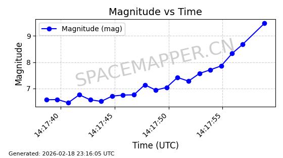 | STARLINK-30617 | 58104 | 58104 | 2023-10-21 同日期轨道 2023-161H 同批次轨道 | 在轨 | 94分钟 | 53.1600 | 474.296 | 476.312 | 0.0001470 | 2026-02-18 00:10:53 | ||