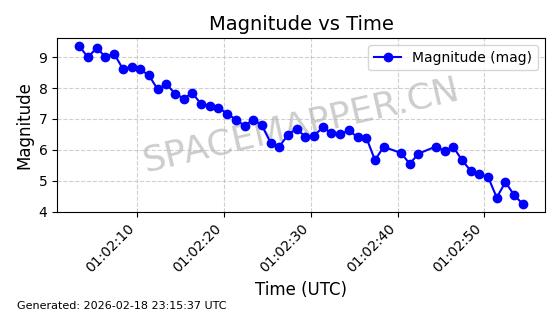 | STARLINK-30802 | 58150 | 58150 | 2023-10-29 同日期轨道 2023-166A 同批次轨道 | 在轨 | 94分钟 | 53.1603 | 474.426 | 476.17 | 0.0001272 | 2026-02-18 00:31:43 | ||