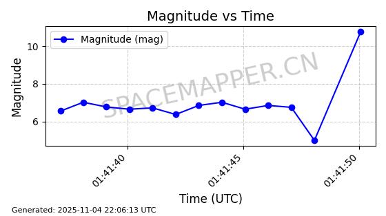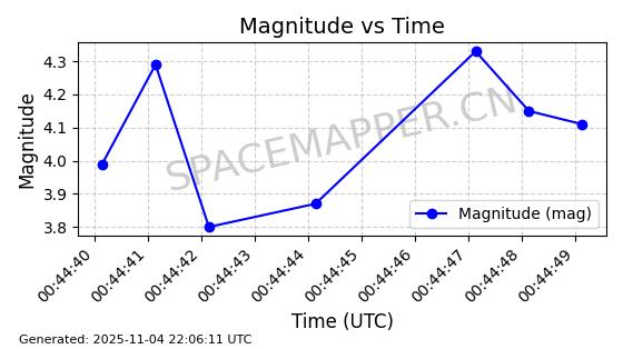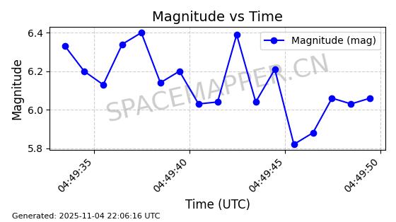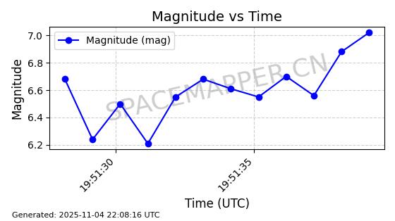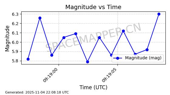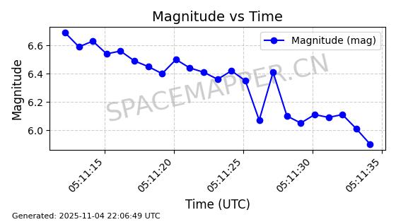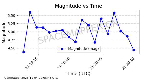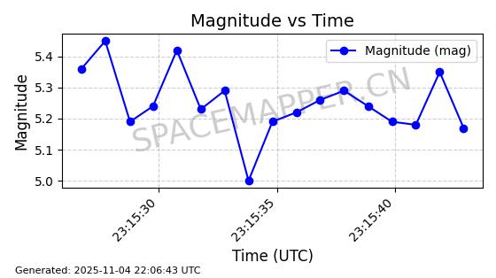 | STARLINK-5119 | 53986 | 53986 | 2022-10-05 同日期轨道 2022-125Y 同批次轨道 | 在轨 | 95分钟 | 53.2177 | 538.84 | 540.654 | 0.0001310 | 2025-11-04 00:10:13 | ||