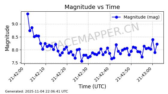 | STARLINK-5138 | 54078 | 54078 | 2022-10-20 同日期轨道 2022-136AD 同批次轨道 | 在轨 | 91分钟 | 53.2138 | 313.627 | 314.395 | 0.0000573 | 2025-11-04 08:00:03 | ||