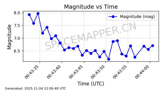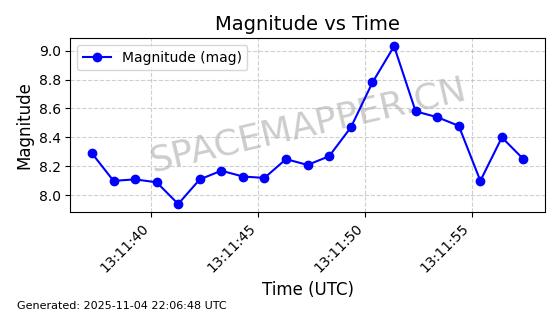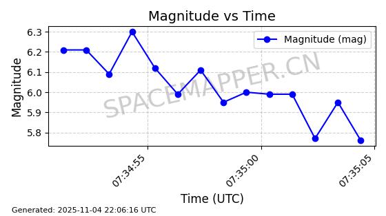 | STARLINK-5165 | 54081 | 54081 | 2022-10-20 同日期轨道 2022-136AG 同批次轨道 | 已陨落 | 87分钟 | 53.1944 | 145.907 | 153.217 | 0.0005598 | 2025-10-14 06:44:09 | ||