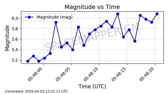 | STARLINK-5126 | 54012 | 54012 | 2022-10-05 同日期轨道 2022-125BA 同批次轨道 | 在轨 | 95分钟 | 53.2169 | 538.98 | 540.518 | 0.0001111 | 2026-04-08 05:25:27 | ||