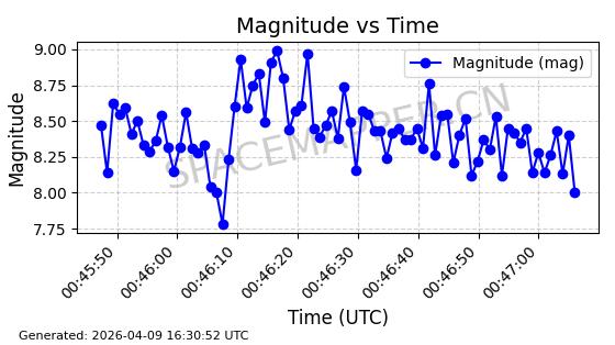 | STARLINK-5172 | 54064 | 54064 | 2022-10-20 同日期轨道 2022-136P 同批次轨道 | 在轨 | 95分钟 | 53.2170 | 538.873 | 540.609 | 0.0001254 | 2026-04-08 04:11:59 | ||