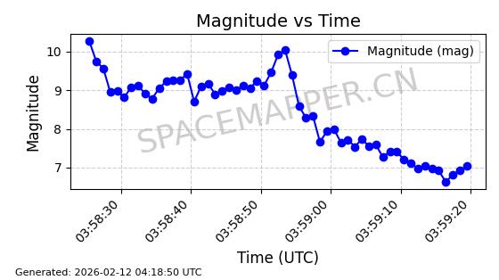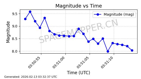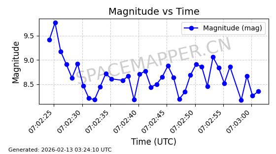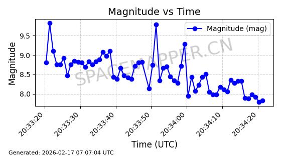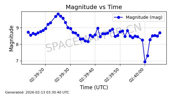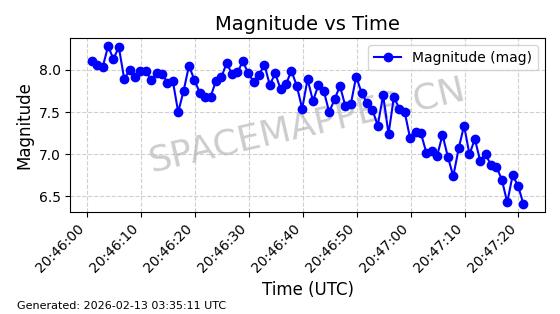 | STARLINK-1523 | 46028 | 46028 | 2020-08-07 同日期轨道 2020-055B 同批次轨道 | 在轨 | 96分钟 | 53.0551 | 546.262 | 548.15 | 0.0001362 | 2026-02-15 22:46:07 | ||