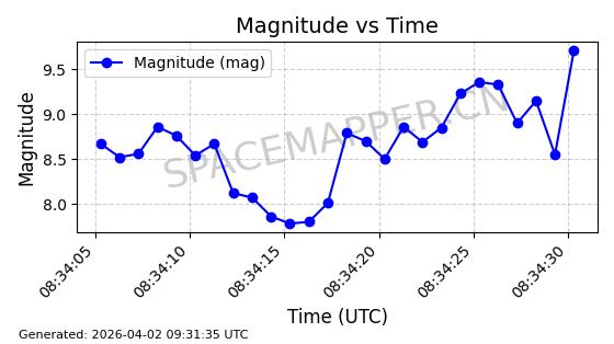 | STARLINK-1355 | 45563 | 45563 | 2020-04-22 同日期轨道 2020-025AJ 同批次轨道 | 已陨落 | 88分钟 | 53.0184 | 157.772 | 161.162 | 0.0002592 | 2025-09-25 16:17:37 | ||