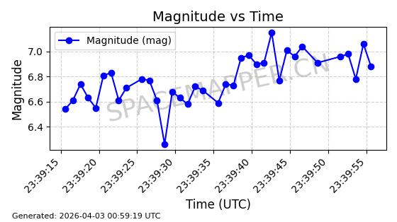 | STARLINK-1433 | 45711 | 45711 | 2020-06-04 同日期轨道 2020-035BG 同批次轨道 | 在轨 | 92分钟 | 53.0470 | 384.182 | 392.318 | 0.0006012 | 2026-04-03 06:17:10 | ||