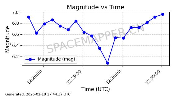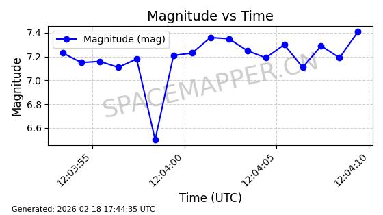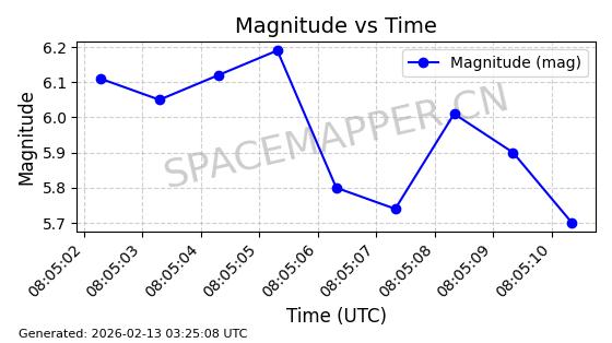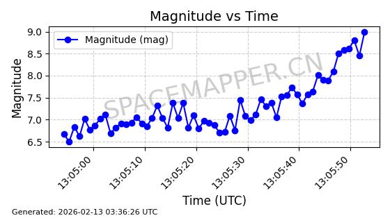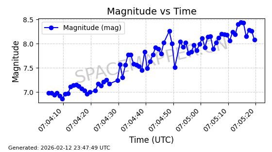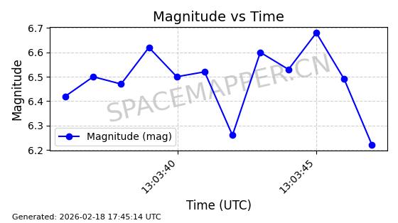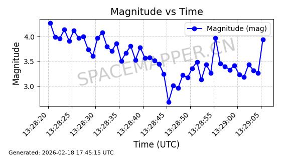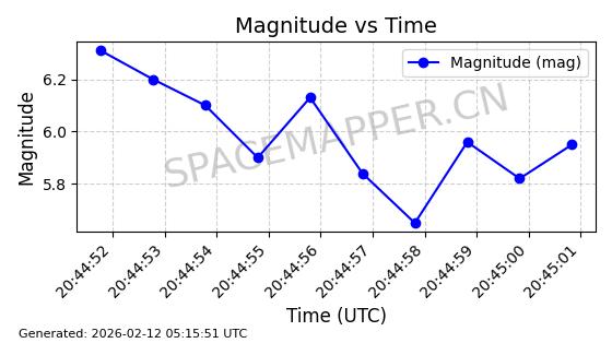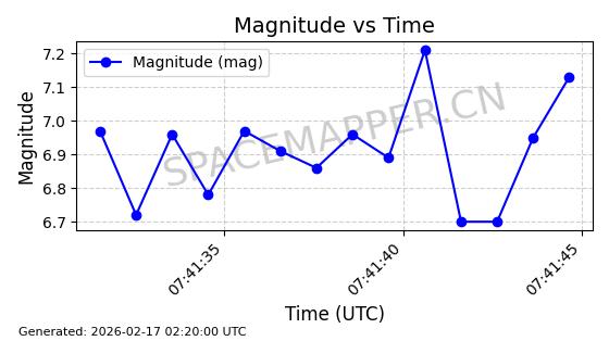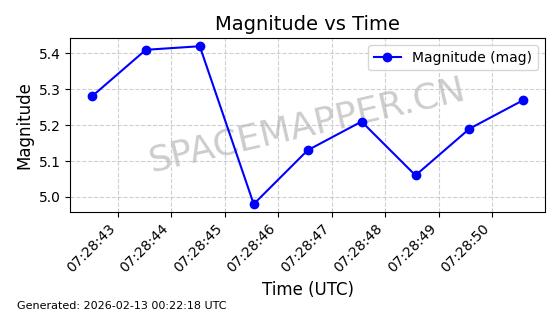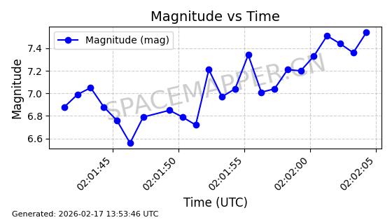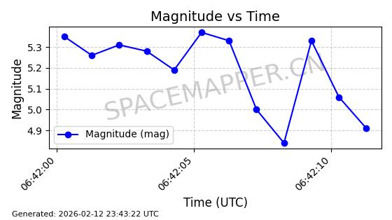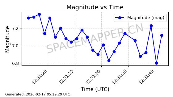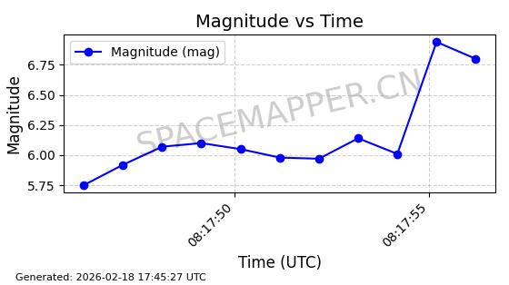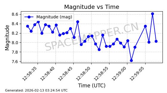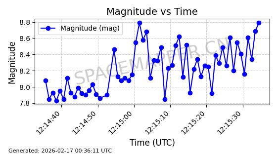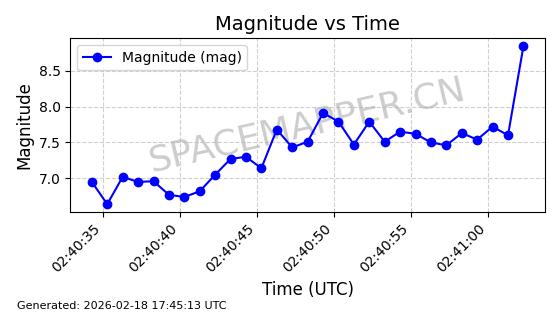 | STARLINK-31275 | 59197 | 59197 | 2024-03-10 同日期轨道 2024-045V 同批次轨道 | 在轨 | 94分钟 | 42.9999 | 482.231 | 483.889 | 0.0001208 | 2026-02-17 12:26:00 | ||
