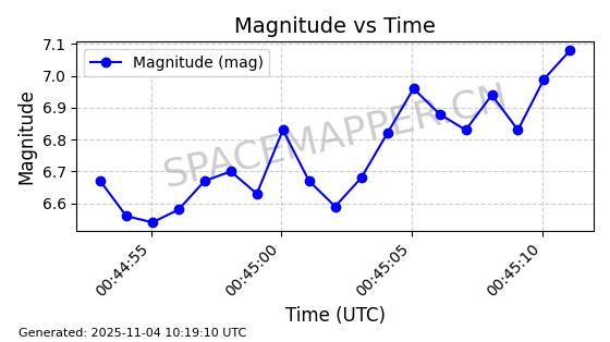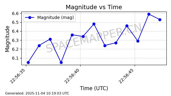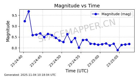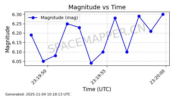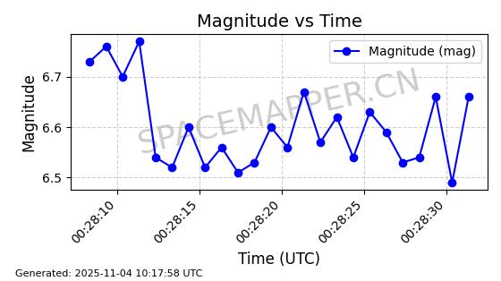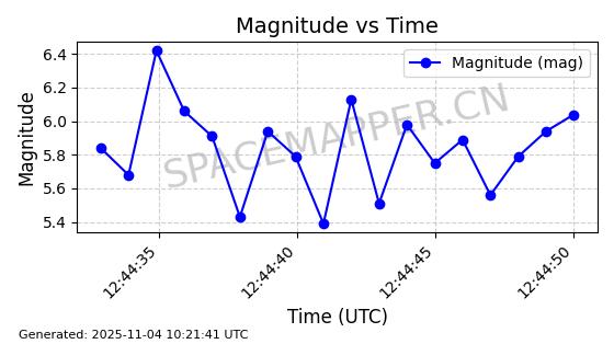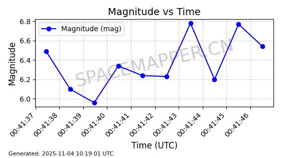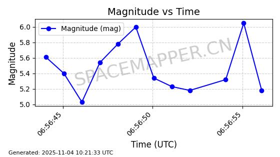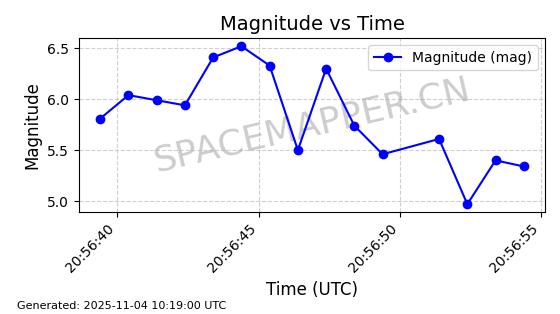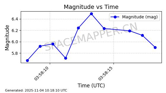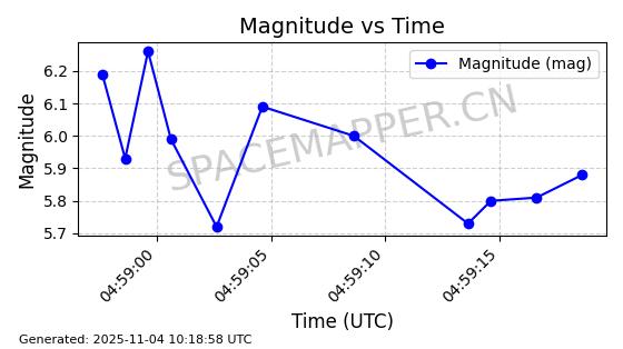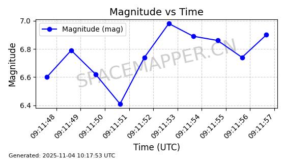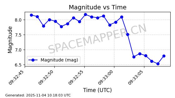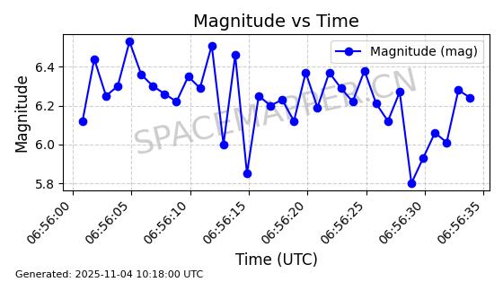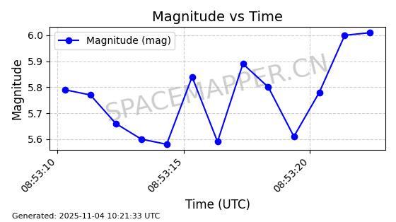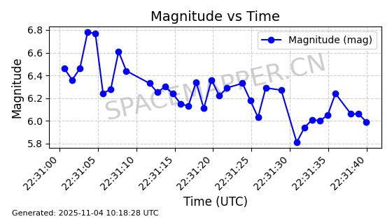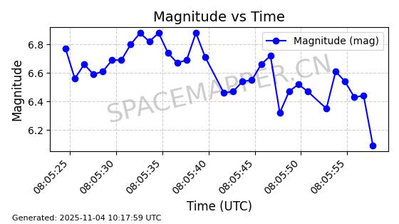 | STARLINK-5733 | 56925 | 56925 | 2023-06-12 同日期轨道 2023-083BB 同批次轨道  |  在轨 | 96分钟 | 43.0044 | 558.385 | 559.809 | 0.0001025 | 2025-11-01  23:41:15  |
