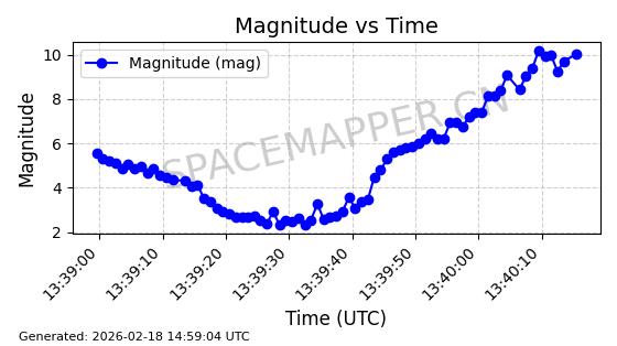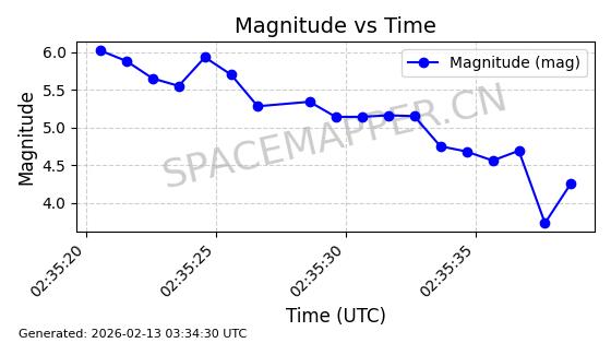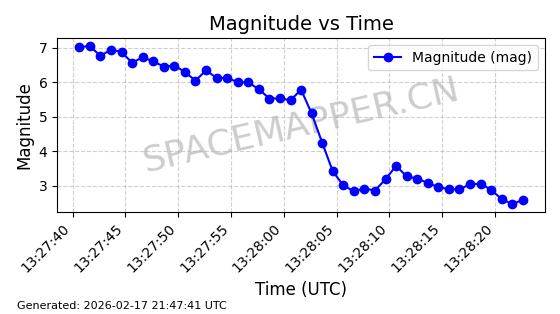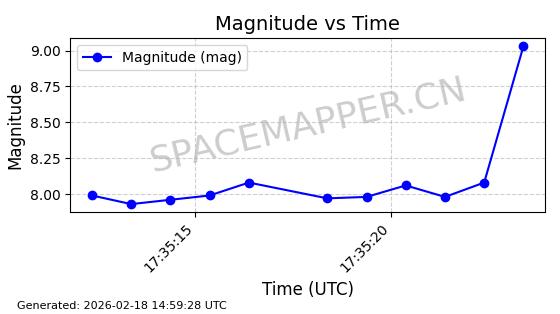 | STARLINK-31759 | 59740 | 59740 | 2024-05-13 同日期轨道 2024-090L 同批次轨道 | 在轨 | 94分钟 | 43.0019 | 482.42 | 483.644 | 0.0000891 | 2026-02-17 01:47:33 | ||