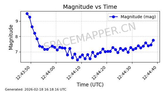 | STARLINK-31766 | 59723 | 59723 | 2024-05-10 同日期轨道 2024-088R 同批次轨道 | 在轨 | 94分钟 | 53.1593 | 474.354 | 476.218 | 0.0001359 | 2026-02-16 19:19:52 | ||