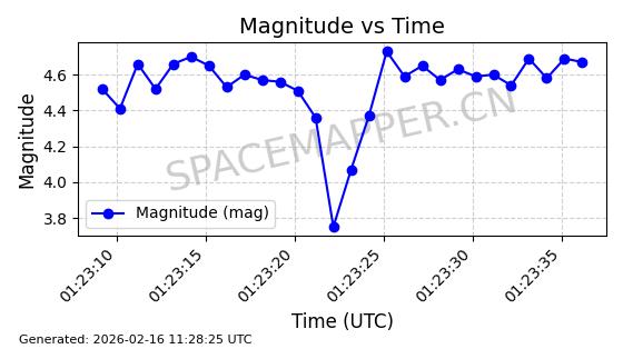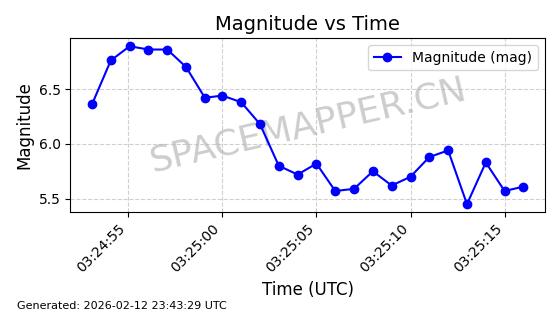 | STARLINK-11102 | 60065 | 60065 | 2024-06-19 同日期轨道 2024-113G 同批次轨道 | 在轨 | 92分钟 | 53.1583 | 359.064 | 360.364 | 0.0000964 | 2026-02-17 01:23:56 | ||