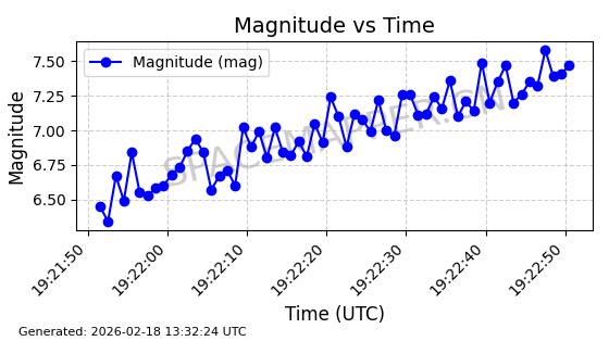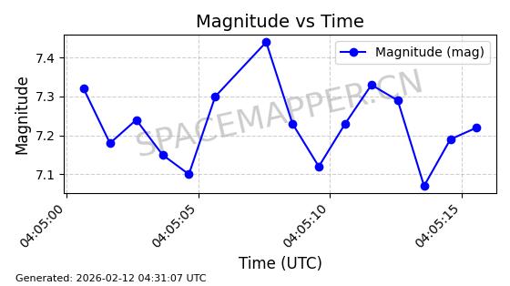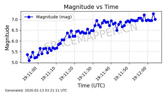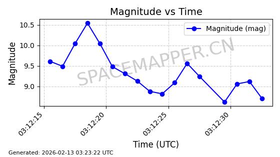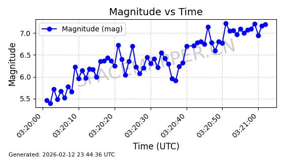 | STARLINK-11184 | 60071 | 60071 | 2024-06-19 同日期轨道 2024-113N 同批次轨道 | 在轨 | 92分钟 | 53.1582 | 359.029 | 360.441 | 0.0001047 | 2026-02-16 23:10:01 | ||