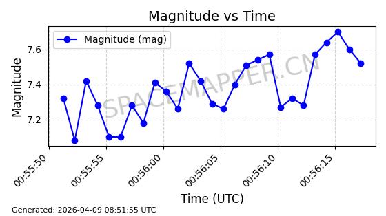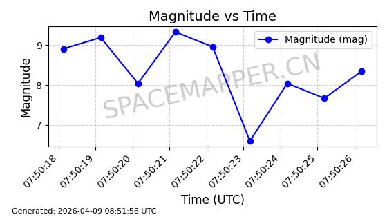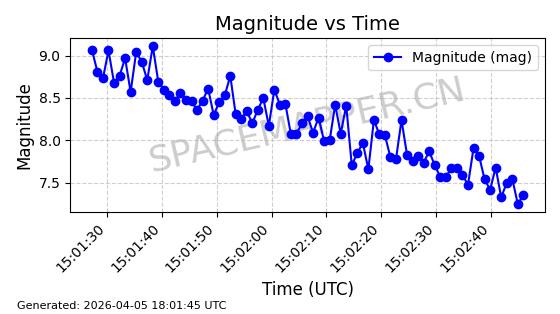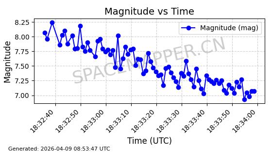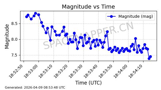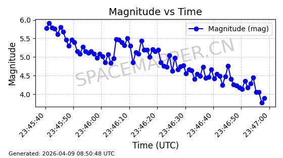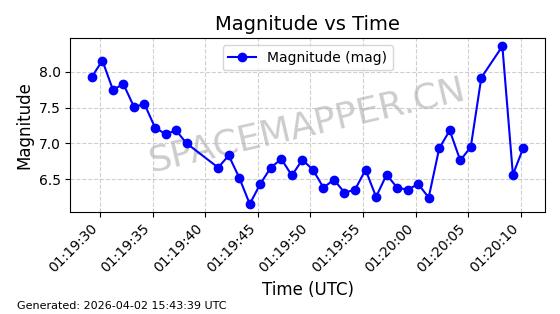 | STARLINK-6289 | 56408 | 56408 | 2023-05-04 同日期轨道 2023-061AL 同批次轨道 | 在轨 | 94分钟 | 43.0007 | 482.519 | 483.529 | 0.0000736 | 2026-04-08 03:33:58 | ||