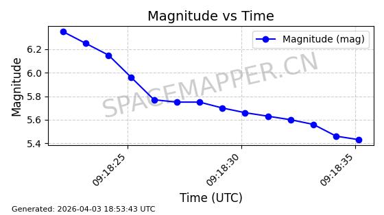 | STARLINK-6284 | 56403 | 56403 | 2023-05-04 同日期轨道 2023-061AF 同批次轨道 | 已陨落 | 88分钟 | 42.9891 | 159.734 | 164.082 | 0.0003324 | 2026-03-04 12:43:35 | ||