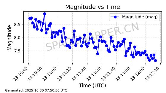 | STARLINK-1588 | 46118 | 46118 | 2020-08-18 同日期轨道 2020-057B 同批次轨道 | 已陨落 | 87分钟 | 53.0242 | 127.628 | 137.706 | 0.0007738 | 2025-05-31 21:24:49 | ||