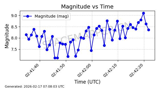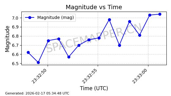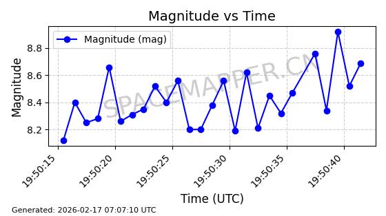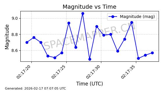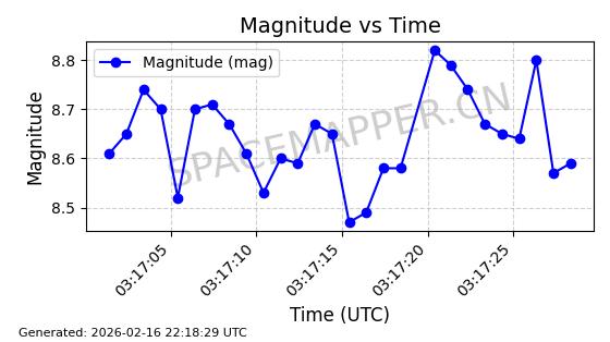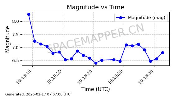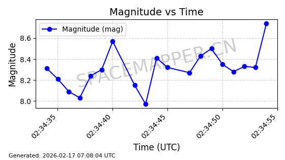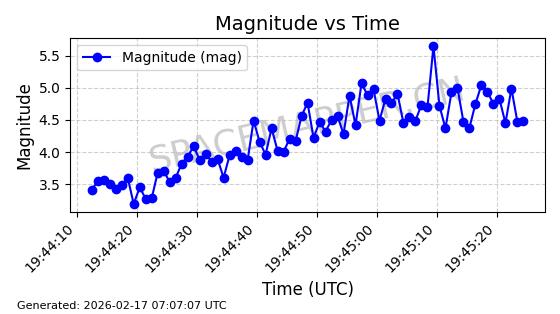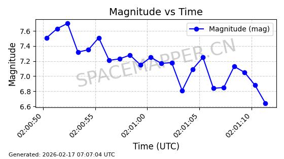 | STARLINK-1625 | 46131 | 46131 | 2020-08-18 同日期轨道 2020-057Q 同批次轨道 | 在轨 | 91分钟 | 53.0514 | 342.116 | 351.888 | 0.0007265 | 2026-02-16 06:00:02 | ||