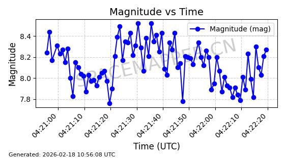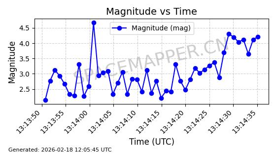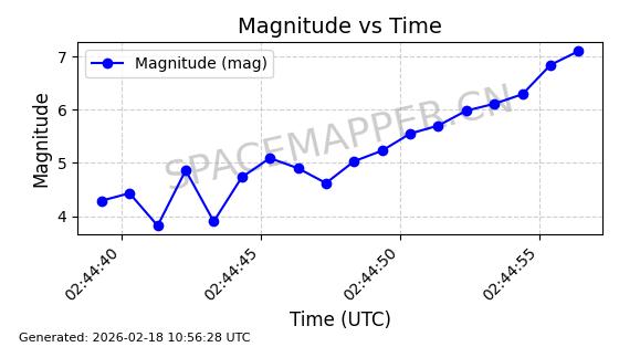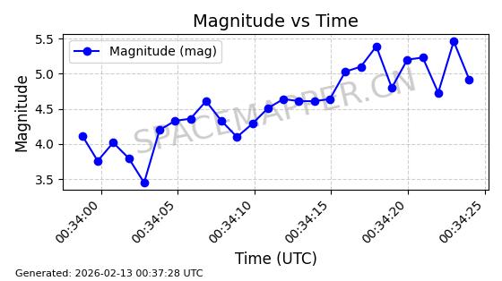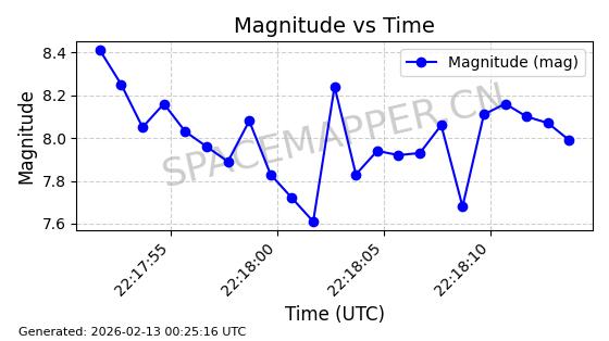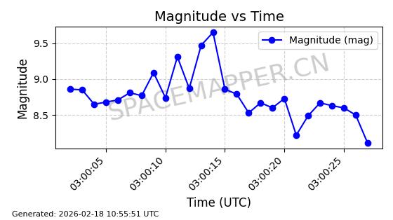 | STARLINK-32276 | 60944 | 60944 | 2024-08-31 同日期轨道 2024-155W 同批次轨道 | 在轨 | 94分钟 | 53.1590 | 474.016 | 476.4 | 0.0001739 | 2026-02-16 18:14:43 | ||