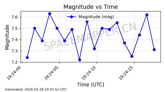 | STARLINK-11307 | 61210 | 61210 | 2024-09-20 同日期轨道 2024-171L 同批次轨道 | 在轨 | 92分钟 | 53.1584 | 358.981 | 360.453 | 0.0001092 | 2026-02-17 01:25:48 | ||