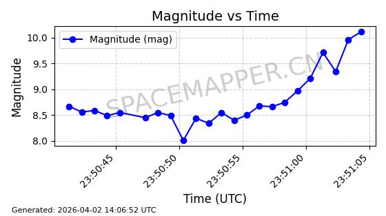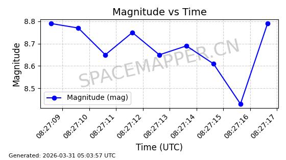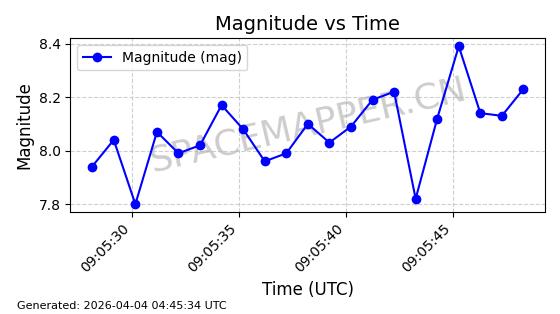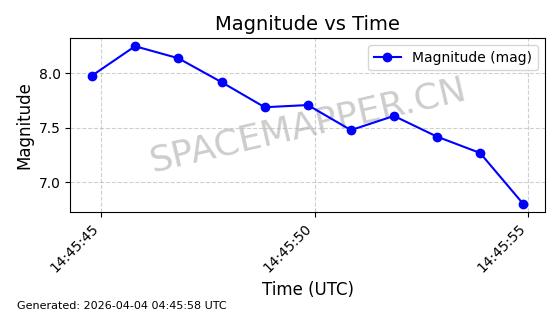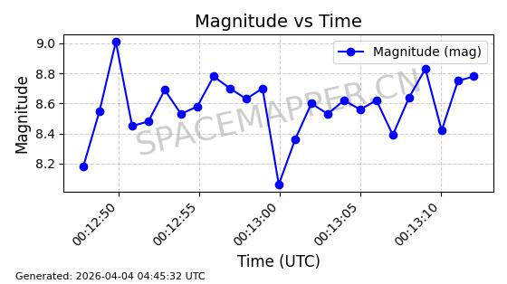 | STARLINK-1605 | 46123 | 46123 | 2020-08-18 同日期轨道 2020-057G 同批次轨道 | 已陨落 | 87分钟 | 53.0212 | 146.478 | 151.744 | 0.0004033 | 2026-02-11 18:51:08 | ||