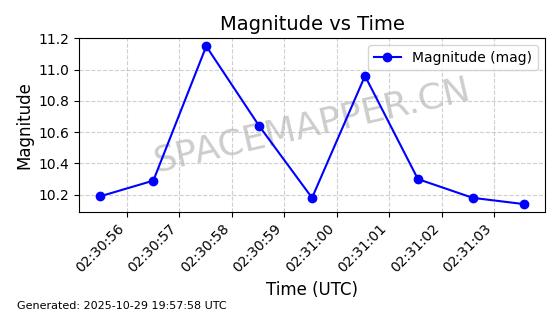 | ONEWEB-0158 | 48054 | 48054 | 2021-03-25 同日期轨道 2021-025N 同批次轨道 | 在轨 | 110分钟 | 87.9038 | 1208.371 | 1211.155 | 0.0001834 | 2025-10-28 14:59:26 | ||