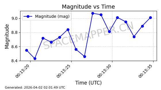 | 卫星名称 | AOE ID | NORAD ID | 发射日期 国际编号 | 在轨状态 | 轨道周期 | 轨道倾角 (度) | 近地点 (Km) | 远地点 (Km) | 偏心率 | 更新时间 (UTC) | 近期光变曲线 | 服务 |