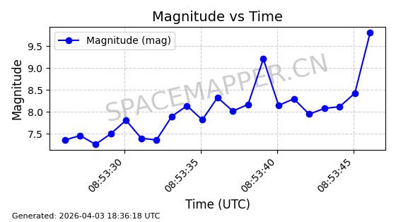 | ONEWEB-0603 | 54667 | 54667 | 2022-12-08 同日期轨道 2022-166AB 同批次轨道 | 在轨 | 109分钟 | 87.9185 | 1176.808 | 1179.084 | 0.0001505 | 2026-04-03 05:11:53 | ||