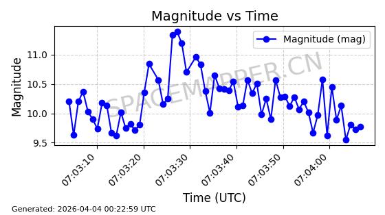 | ONEWEB-0647 | 56079 | 56079 | 2023-03-26 同日期轨道 2023-043AK 同批次轨道 | 在轨 | 109分钟 | 87.8922 | 1200.416 | 1203.114 | 0.0001779 | 2026-04-03 05:00:28 | ||