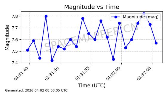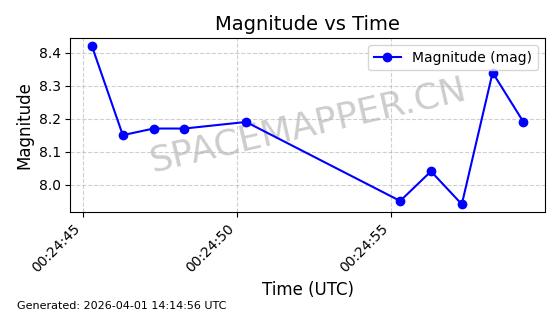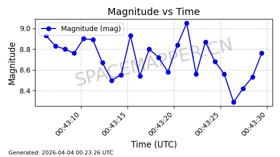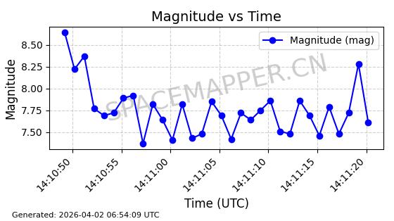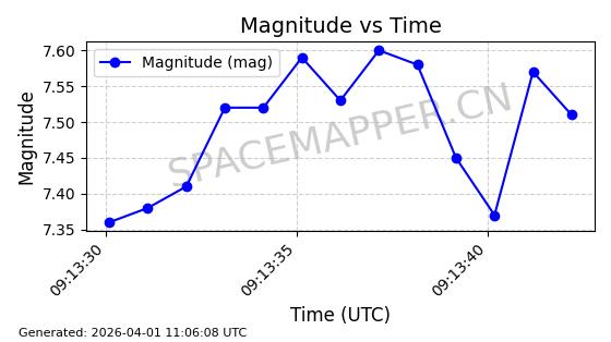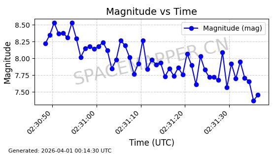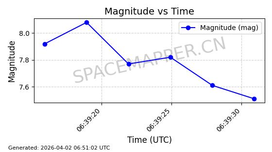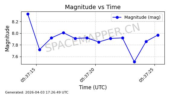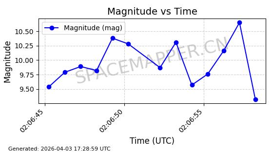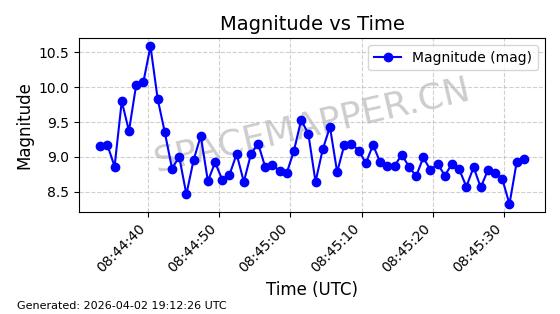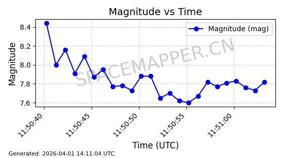 | COSMOS 726 | 7736 | 7736 | 1975-04-11 同日期轨道 1975-028A 同批次轨道 | 在轨 | 104分钟 | 82.9914 | 951.394 | 987.396 | 0.0024499 | 2026-04-02 05:20:29 | ||