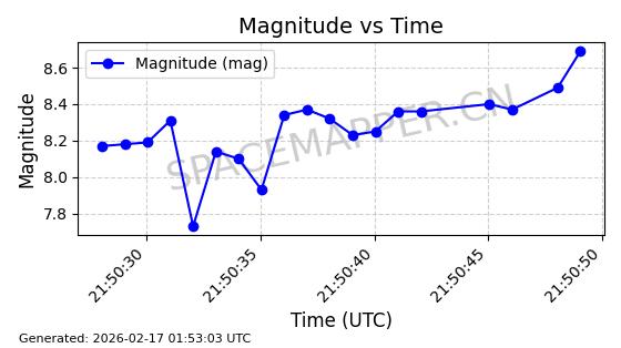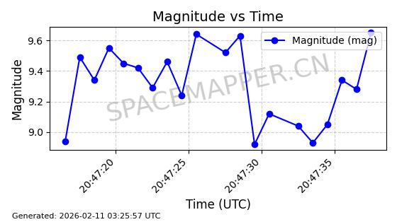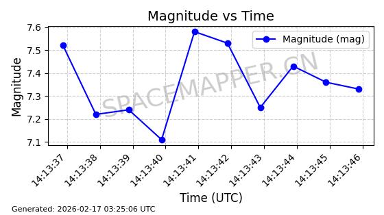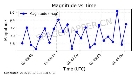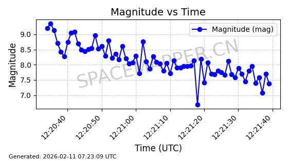 | ORBCOMM FM 17 | 25413 | 25413 | 1998-08-02 同日期轨道 1998-046A 同批次轨道 | 在轨 | 100分钟 | 44.9930 | 771.686 | 773.8 | 0.0001478 | 2026-02-15 19:02:30 | ||