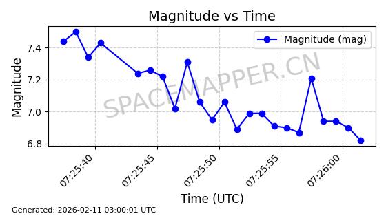 | ORBCOMM FM 7 | 25119 | 25119 | 1997-12-23 同日期轨道 1997-084H 同批次轨道 | 在轨 | 100分钟 | 45.0131 | 732.394 | 737.32 | 0.0003462 | 2026-02-16 03:30:57 | ||
