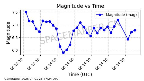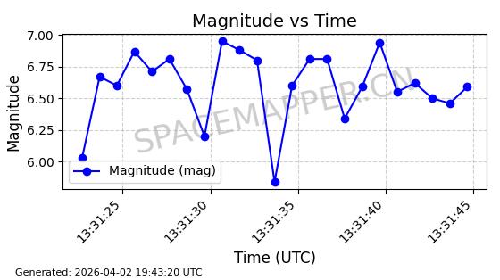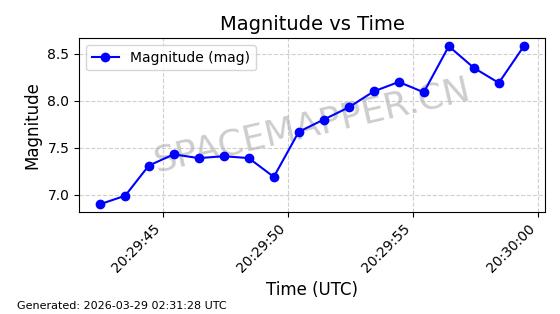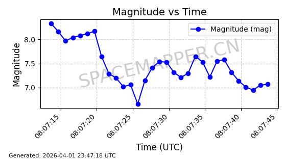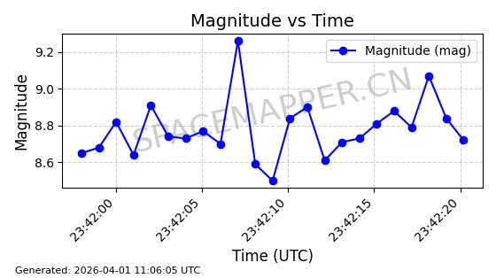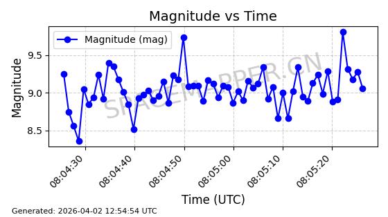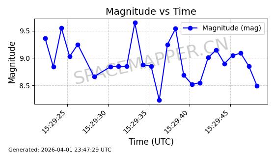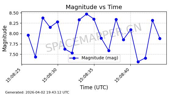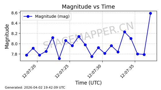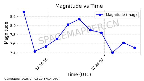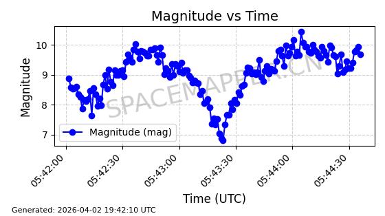 | GLOBALSTAR M025 | 25770 | 25770 | 1999-06-10 同日期轨道 1999-031A 同批次轨道 | 在轨 | 128分钟 | 51.9803 | 2045.781 | 2048.931 | 0.0001869 | 2026-04-02 08:07:12 | ||