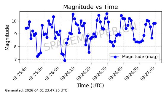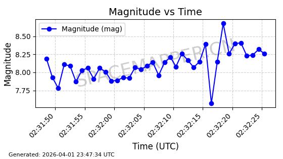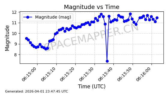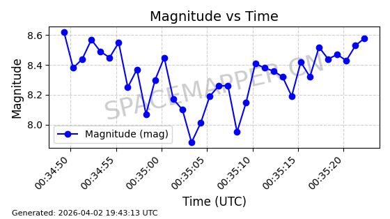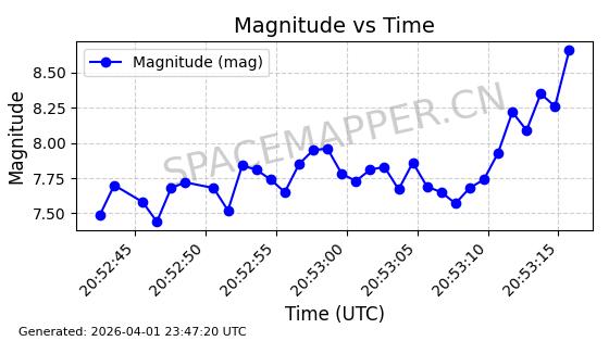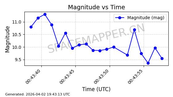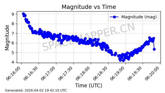 | GLOBALSTAR M060 | 26083 | 26083 | 2000-02-08 同日期轨道 2000-008C 同批次轨道 | 在轨 | 118分钟 | 52.0040 | 1600.056 | 1605.274 | 0.0003269 | 2026-04-02 00:34:53 | ||