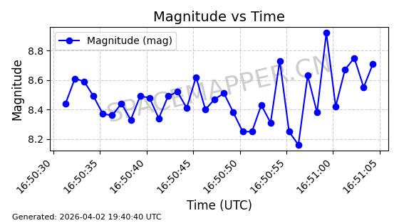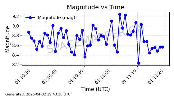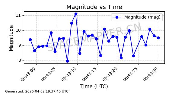 | GLOBALSTAR M030 | 25854 | 25854 | 1999-07-10 同日期轨道 1999-037D 同批次轨道 | 在轨 | 125分钟 | 51.9861 | 1885.138 | 1891.544 | 0.0003874 | 2026-04-02 00:32:08 | ||