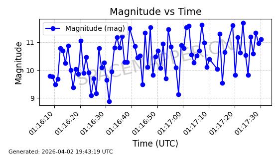 | GLOBALSTAR M019 | 25677 | 25677 | 1999-04-15 同日期轨道 1999-019B 同批次轨道 | 在轨 | 119分钟 | 51.9910 | 1618.267 | 1620.331 | 0.0001290 | 2026-04-02 03:32:28 | ||