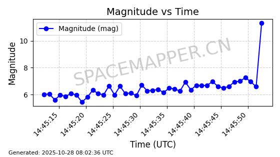 | METOP-B | 38771 | 38771 | 2012-09-17 同日期轨道 2012-049A 同批次轨道 | 在轨 | 101分钟 | 98.6868 | 819.727 | 821.639 | 0.0001327 | 2025-10-27 23:12:33 | ||