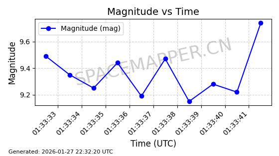 | ONEWEB-0319 | 49105 | 49105 | 2021-08-21 同日期轨道 2021-075AG 同批次轨道 | 在轨 | 109分钟 | 87.9082 | 1191.945 | 1195.481 | 0.0002334 | 2026-01-27 00:11:37 | ||