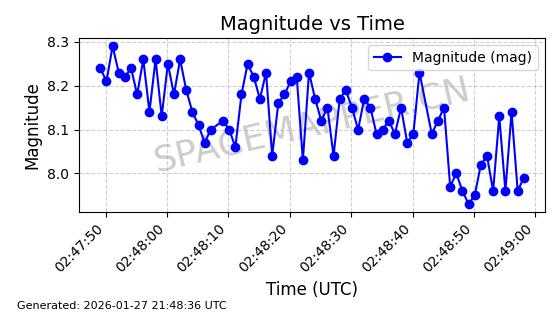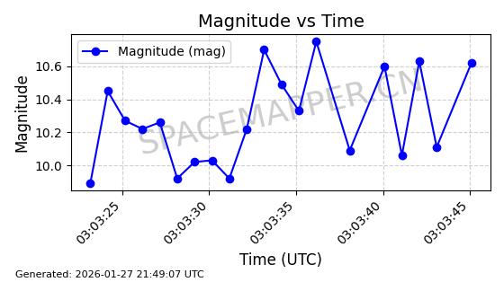 | ONEWEB-0300 | 49089 | 49089 | 2021-08-21 同日期轨道 2021-075Q 同批次轨道 | 在轨 | 110分钟 | 87.8939 | 1212.33 | 1215.112 | 0.0001832 | 2026-01-26 21:54:50 | ||