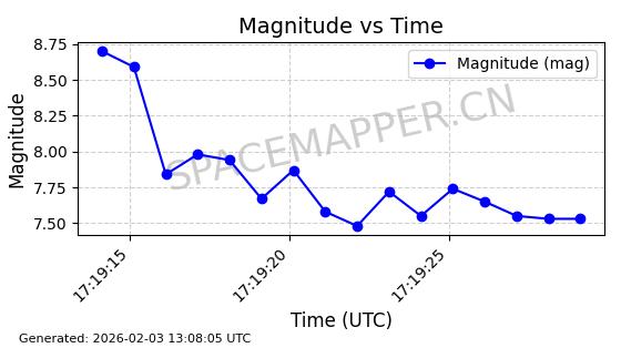 | ORBCOMM FM 17 | 25413 | 25413 | 1998-08-02 同日期轨道 1998-046A 同批次轨道 | 在轨 | 100分钟 | 44.9930 | 771.217 | 774.451 | 0.0002261 | 2026-02-03 21:27:44 | ||
